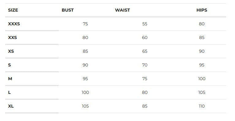 Our model is 172cm (5'6") tall with a 81cm (31") bust, a 64cm (25") waist and 91cm (35") hips
